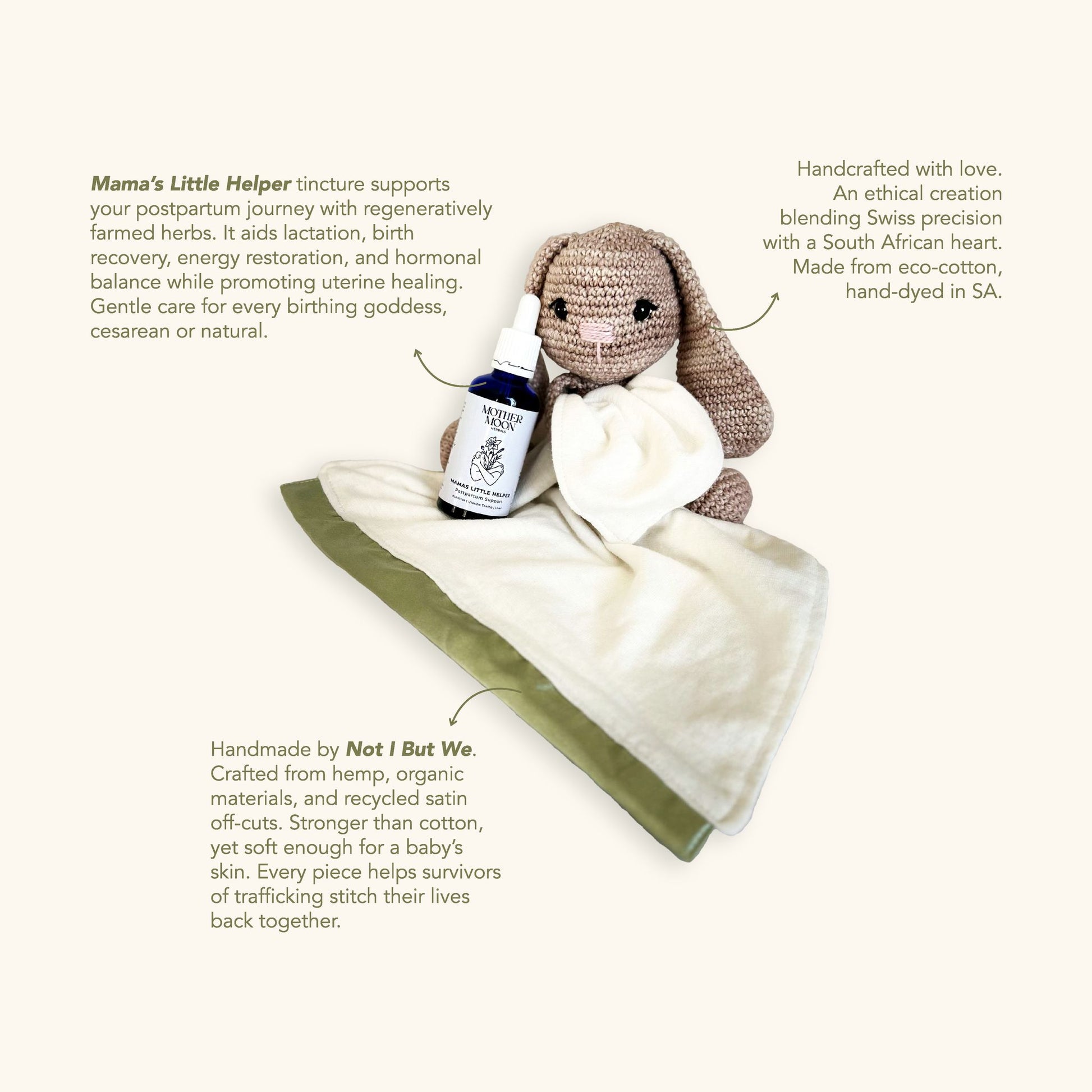 This eco-conscious mama’s dream bundle includes a keepsake crochet bunny, lovingly handmade from organic cotton, an organic hemp versatile blankie with silky satins for little hands to soothe, and a healing tincture to support any mom during the postpartum period.